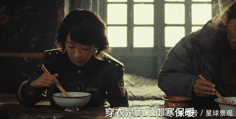 剧中白菊的队友们都是一群大男人,吃相自然更加“豪迈”一些,简单的清水煮挂面,和煮萝卜片、蒜瓣,依然吃的有滋有味,狼吞虎咽的模样,像是好几天没吃过饱饭了一样。